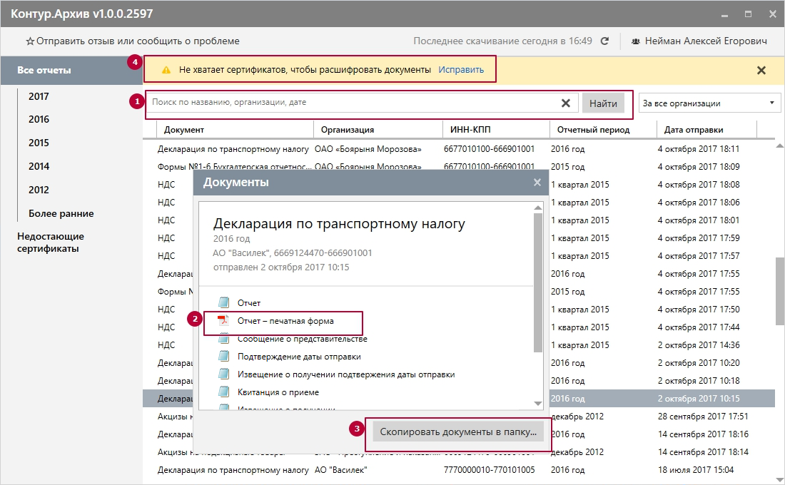 • Если на вашем компьютере нет сертификатов для расшифровки документов,  вы увидите уведомление об этом (см. п. 4 на рис. 1). Нажмите на ссылку «Исправить», и Контур.Архив покажет список всех недостающих сертификатов (см. рис. 2).