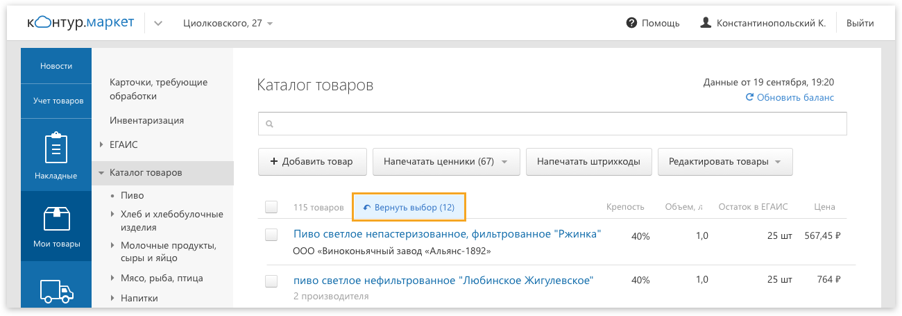 Система вернет галочки ранее отмеченным товарам, вы сможете редактировать их дальше или отправить на печать ценники и штрихкоды.